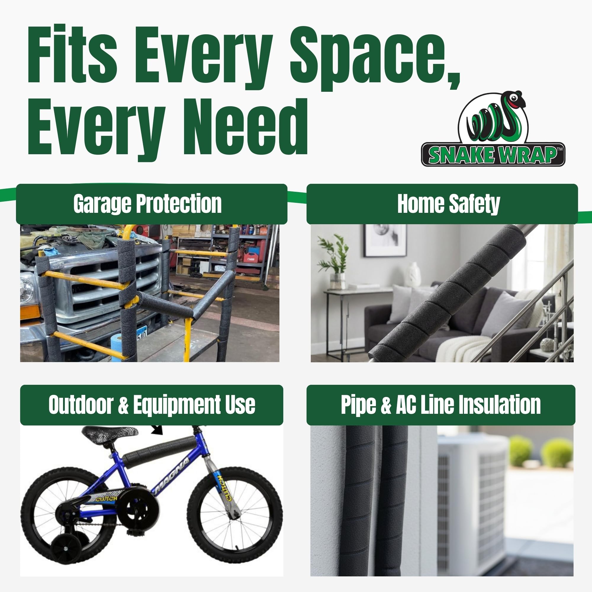 - Durable Self-Tightening Design: This precut foam noodle features a firm 5/8-inch wall thickness that grips firmly around rails, bars, and uneven edges. With its snake-like construction, SnakeWrap adjusts easily to pipe wrap around and roll bar padding applications.